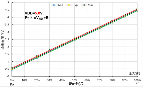 ملحوظة: Vout هو جهد الخرج التناظري (الوحدة: V)؛ P هي قيمة الضغط (بالكيلو باسكال)؛ ك. يمثل ب المعامل الخطي والإزاحة، كما هو موضح في الجدول أدناه.